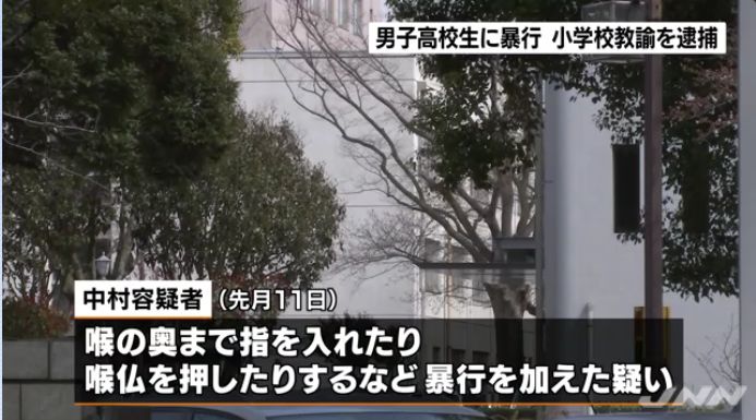 男子高校生の口の中に指を入れたうえで喉仏を押すなどの暴行を加えたとして、公立小学校教諭の男が逮捕されました。暴行の疑いで逮捕されたのは、千葉県の公立小学校教諭・中村将容疑者(29)です。