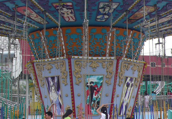 ディズニーキャラが描かれていたはずの回転ブランコが日本のアニメ絵に書き換えられていた!セーラームーンやCCさくら、幽々白書など、微妙に古いアニメキャラたちがぐるぐる回転する様はなかなかシュール。(コアニュース編集部注:こっちのほうがタチ悪い!)