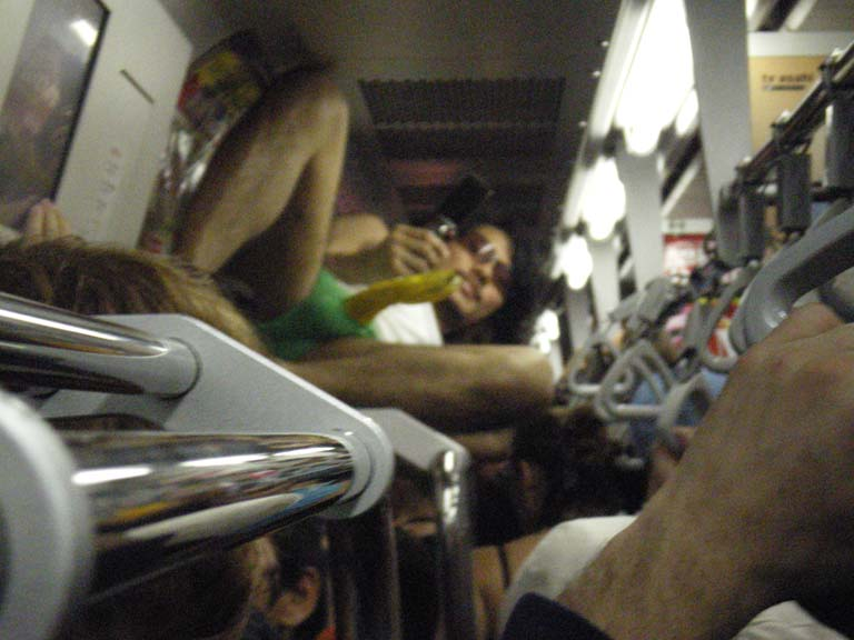 飲食や絶叫は当然の状況で、裸になって騒ぐ人、網棚の上によじ登る人なども続出した。