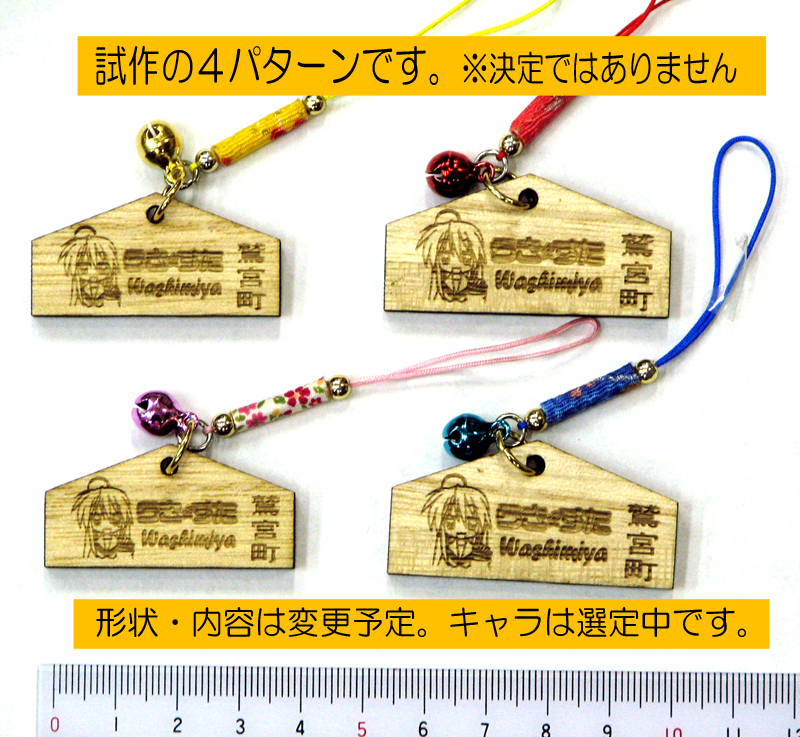 鷲宮町商工会はアニメファンの参拝客も訪れる町内の鷲宮神社などでミニ絵馬にアニメキャラクターを描いた携帯電話用ストラップ=写真、試作品=を12月から販売する。