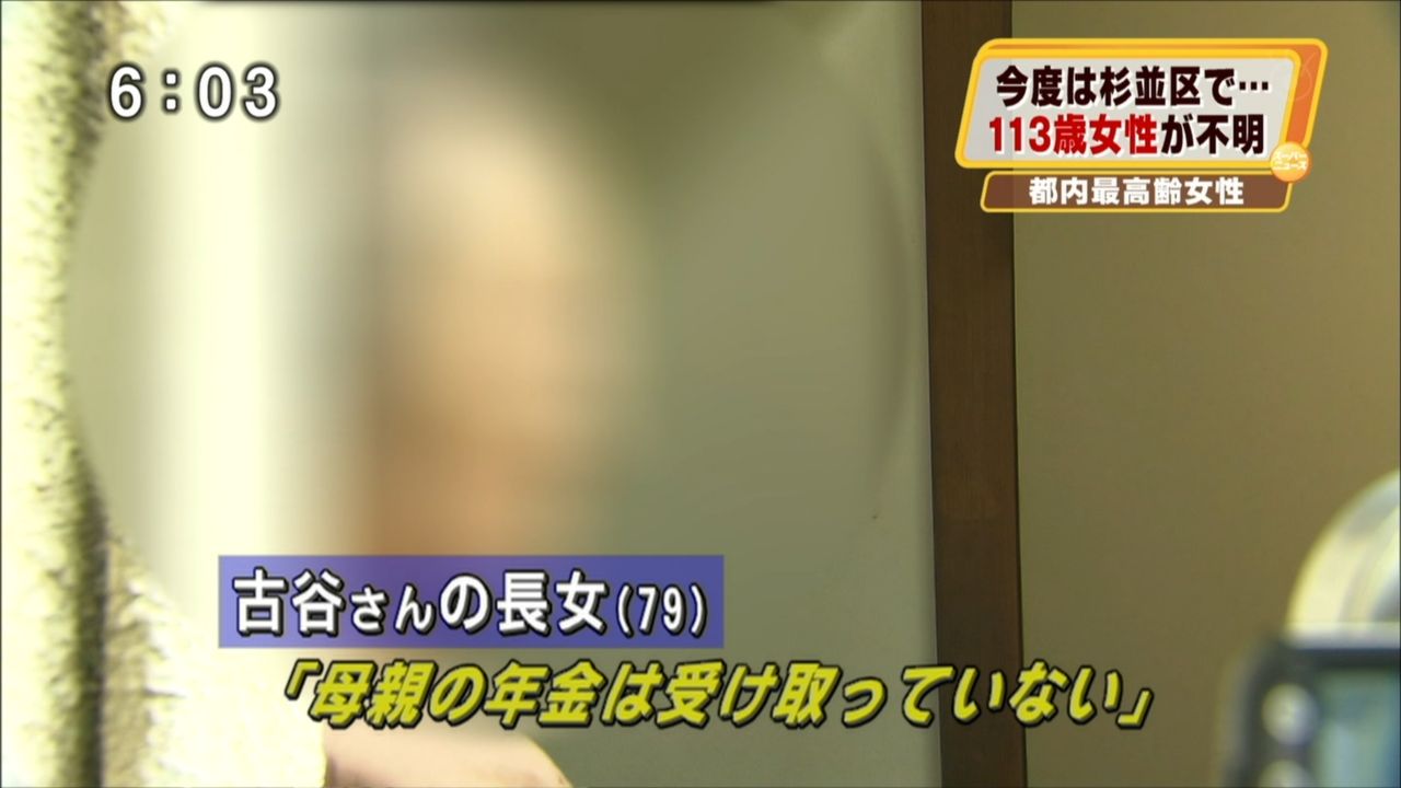 都内女性最高齢、杉並区の113歳が所在不明東京都杉並区は2日、区内に住民登録のある113歳の女性の所在が分からなくなっていると発表した。