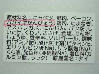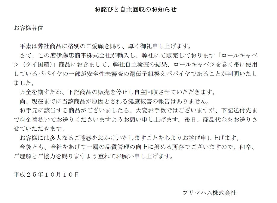 お客様各位平素は弊社商品に格別のご愛顧を賜り、厚く御礼申し上げます。 さて、この度伊藤忠商事株式会社が輸入し、弊社にて販売しております「ロールキャベツ(タイ国産)」商品におきまして、弊社自主検査の結果、ロールキャベツを巻く帯に使用しているパパイヤの一部が安全性未審査の遺伝子組換えパパイヤであることが判明いたしました。