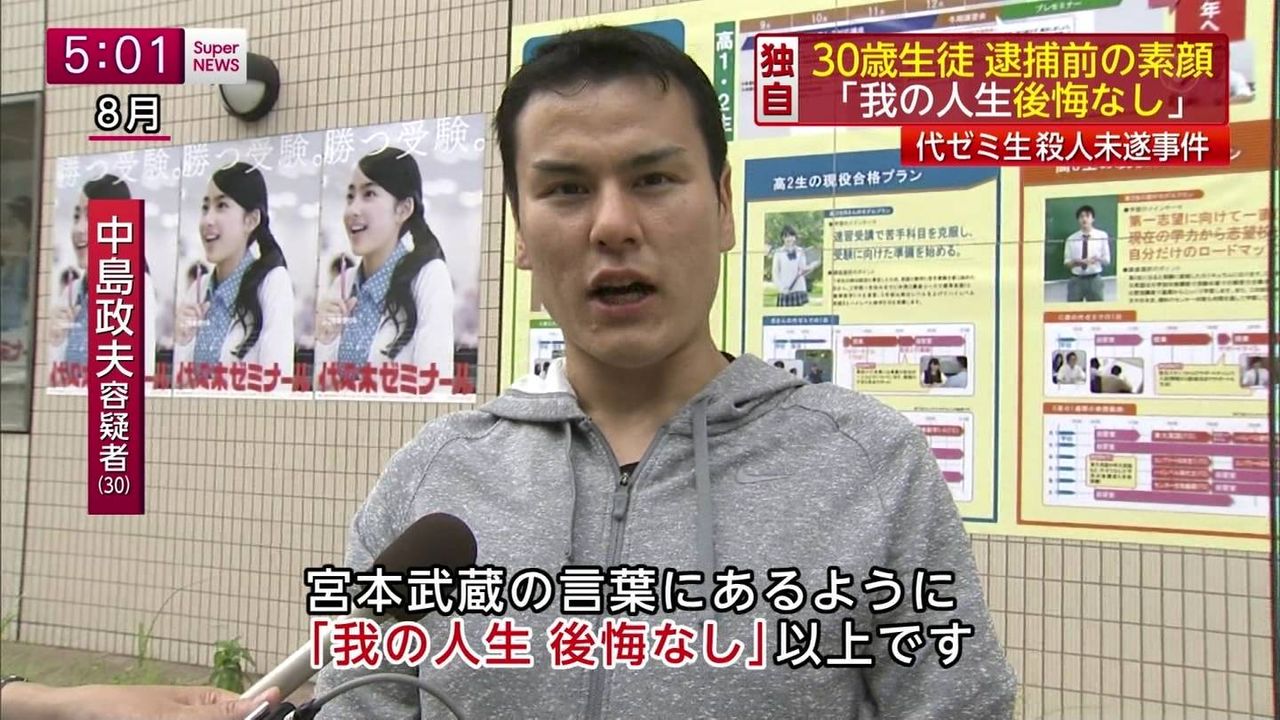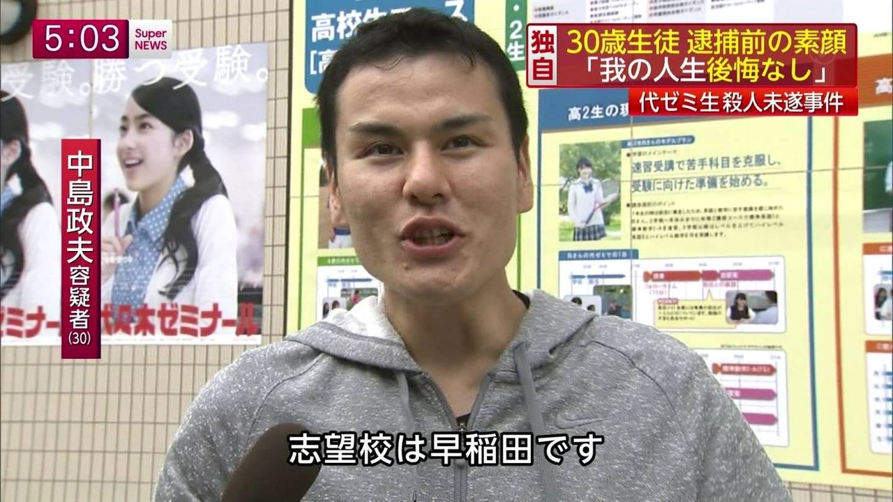 Ê¡²¬¡¦Ë̶彣»Ô¤ÎÂ塹ÌÚ¥¼¥ß¥Ê¡¼¥ë¤Ç11Æü¡¢ÃË»ÒÀ¸Å̤ò»É¤·¤¿30ºÐ¤ÎͽÈ÷¹»À¸¤ÎÃˤ¬ÂáÊᤵ¤ì¤¿¡£¤½¤ÎÃˤÏ2014ǯ8·î¡¢FNN¤Î¼èºà¤ËÅú¤¨¤Æ¤¤¤¿¤³¤È¤¬¤ï¤«¤Ã¤¿¡£¡Ö¤ä¤Ã¤Ñ¤ê¸µµ¤¤È¤ä¤ëµ¤¤¬¥Ê¥ó¥Ð¡¼¥ï¥ó¤À¤È»×¤¤¤Þ¤¹¡£µÜËÜÉð¢¤Î¸ÀÍդˤ¢¤ë¤è¤¦¤Ë¡¢¡Ø²æ¤Î¿ÍÀ¸ ¸å²ù¤Ê¤·¡Ù¡£°Ê¾å¤Ç¤¹¡×¤Ê¤É¤È¡¢¥«¥á¥éÌÜÀþ¤Ç¼«¿®Ëþ¡¹¤Ë¸ì¤ë¤Î¤Ï¡¢ÃæÅçÀ¯É×ÍÆµ¿¼Ô(30)¡£2014ǯ8·î¡¢ÃæÅçÍÆµ¿¼Ô¤Ï¡¢Â塹ÌÚ¥¼¥ß¥Ê¡¼¥ë¤¬Á´¹ñ¤Ë27¤¢¤ëµòÅÀ¤Î¤¦¤Á¡¢20¥«½ê¤òÍè½Õ¡¢Êĺ¿¤¹¤ë¤³¤È¤ò¼õ¤±¡¢FNN¤Î¼èºà¤ËÅú¤¨¤Æ¤¤¤¿¡£ÃæÅçÍÆµ¿¼Ô¤Ï11Æü¡¢Ë̶彣»Ô¾®ÁÒË̶è¤Ë¤¢¤ëÂ塹ÌÚ¥¼¥ß¥Ê¡¼¥ë¤Ç¡¢19ºÐ¤ÎÃË»ÒͽÈ÷¹»À¸¤Îº¸¶»¤Ê¤É¤òÊñÃú¤Ç»É¤·¡¢»¦³²¤·¤è¤¦¤È¤·¤¿»¦¿Í̤¿ë¤Ê¤É¤Îµ¿¤¤¤¬»ý¤¿¤ì¤Æ¤¤¤ë¡£ÃæÅçÍÆµ¿¼Ô¤Ï¡¢Ä´¤Ù¤ËÂФ·¡¢¡Ö¤Ë¤é¤Þ¤ì¤Æ¸ýÏÀ¤Ë¤Ê¤Ã¤¿¡£»¦¤¹¤Ä¤â¤ê¤Ï¤Ê¤«¤Ã¤¿¡×¤Ê¤É¤ÈÏ䷤Ƥ¤¤ë¤È¤¤¤¦¡£