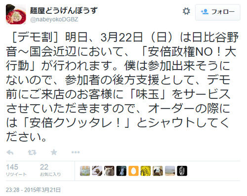 ¥é¡¼¥á¥ó²°¡ØÌͲ°¤É¤¦¤²¤ó¤Ü¤¦¤º¡Ù¤¬¡Ö¥Ç¥â³ä¡×¤È¾Î¤·¤¿¥µ¡¼¥Ó¥¹¤òÄ󶡤·¤Æ¤¤¤ë¤è¤¦¤À¡£3·î22Æü¤Ï¡Ö°ÂÇÜÀ¯¸¢NO¡ªÂç¹Ôư¡×¤Î¥Ç¥â¤¬¹Ô¤ï¤ì¤ëÆü¤Çʼç¤Ï¤³¤Î¥Ç¥â¤Ë»²²Ã½ÐÍ褽¤¦¤Ë¤Ê¤¤¤È¤Î¤³¤È¤Ç¡¢ÍèŹ»þ¤Ë¡Ö°ÂÇÜ¥¯¥½¥Ã¥¿¥ì¡ª¡×¤È¥·¥ã¥¦¥È¤·¤¿µÒ¤ËÌ£¶Ì¤ò¥µ¡¼¥Ó¥¹¤¹¤ë¤È¤Î¤³¤È¤À¡£¤³¤Î¥é¡¼¥á¥ó²°¡ØÌͲ°¤É¤¦¤²¤ó¤Ü¤¦¤º¡Ù¤Ï¤·¤Ð¤Ââ¸æÍÑã¤é¤·¤¯¡¢È¿¸¶È¯¤ä¡¢¡Ö°ÂÇÜÀ¯¸¢NO¡ªÂç¹Ôư¡×¥Ç¥â¤Î¥Ý¥¹¥¿¡¼¤òŹÆâ¤ËŽ¤Ã¤Æ¤¤¤ë¡£