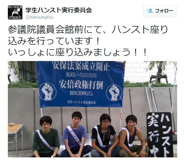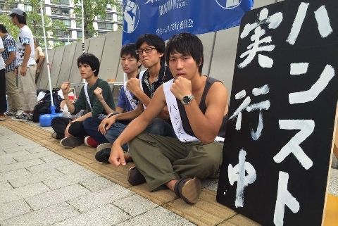 °ÂÊÝË¡°Æ¤ÎÀ®Î©Á˻ߤòÁʤ¨¤ë³ØÀ¸¥°¥ë¡¼¥×¤¬8·î27Æü¡¢Åìµþ¡¦±ÊÅÄÄ®¤Î¹ñ²ñÁ°¤Ç¡¢¿åʬ°Ê³°¤ò¤È¤é¤Ê¤¤Ìµ´ü¸Â¤Î¥Ï¥ó¥¬¡¼¥¹¥È¥é¥¤¥¡Ê¥Ï¥ó¥¹¥È¡Ë¤ò³«»Ï¤·¤¿¡£¤³¤Î¥°¥ë¡¼¥×¤Ï¡¢ÅìµþÅÔÆâ¤ÎÂç³ØÀ¸¤Ç¤Ä¤¯¤ë¡Ö³ØÀ¸¥Ï¥ó¥¹¥È¼Â¹Ô°Ñ°÷²ñ¡×¡£8·î13Æü¤Ë°ÂÊÝË¡°Æ¤ÎÀ®Î©Á˻ߤȰÂÇÜÀ¯¸¢¤ÎÂÇÅݤòÁʤ¨¤ë¤¿¤á¡¢¥Ï¥ó¥¹¥È·è¹Ô¤òȯɽ¤·¤ÆÏÃÂê¤Ë¤Ê¤Ã¤Æ¤¤¤¿¡£