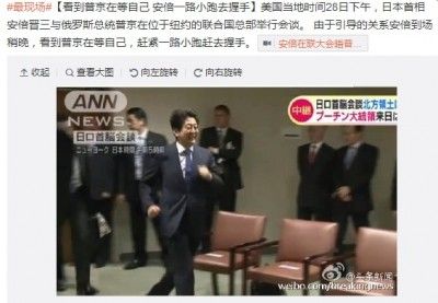 2015年9月29日、中国メディア・新浪は、国連総会出席のため米ニューヨークを訪問中の安倍晋三首相が、プーチン露大統領との会談で、遅れて会場入りしたため小走りで駆け寄って握手したと報じた。笑顔で小走りする安倍首相の様子を伝えた日本メディアの映像が、中国のネット上でも転載され、話題となっている。