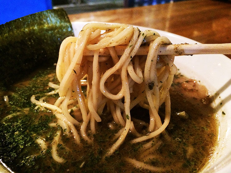 バジルにも似た香ばしさが特徴で、丸くてほどよい硬さの麺がマッチして美味しい。チャーシューは箸でつまんだだけでホロホロと崩れ落ちるほど薄く、これがまたスープをよく吸収して美味。