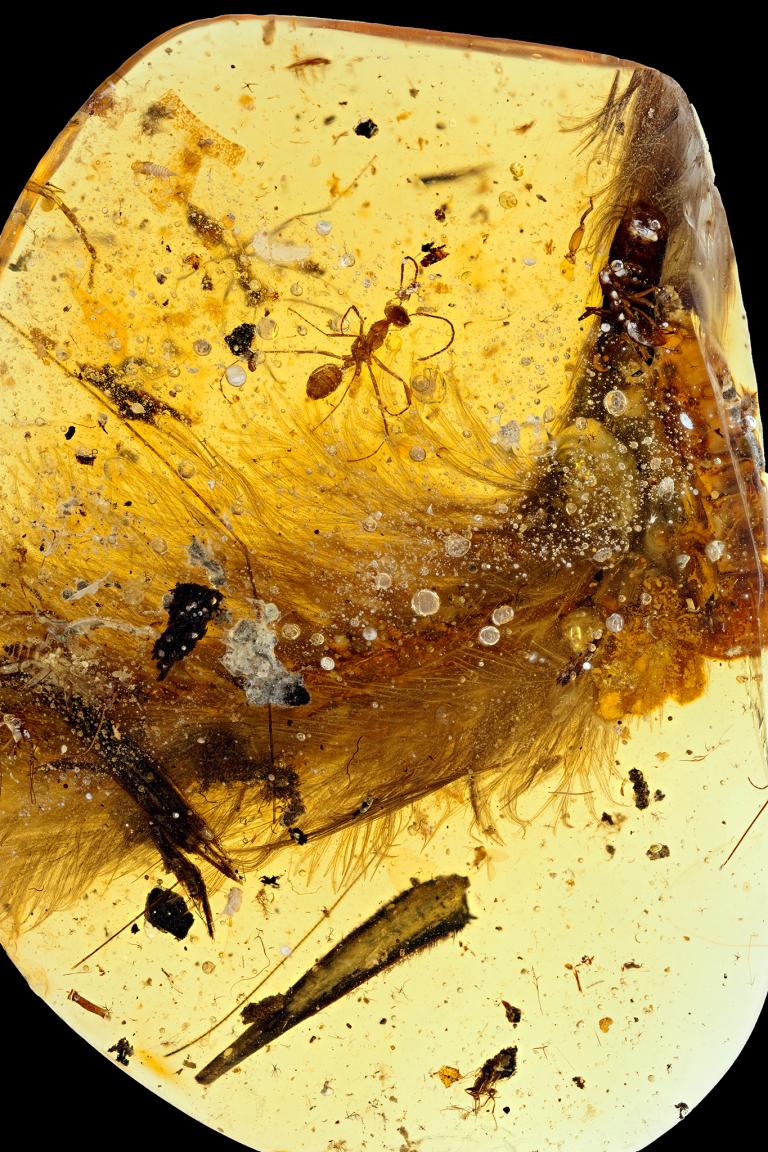 恐竜の尻尾が琥珀の中に閉じ込められた状態で発見される