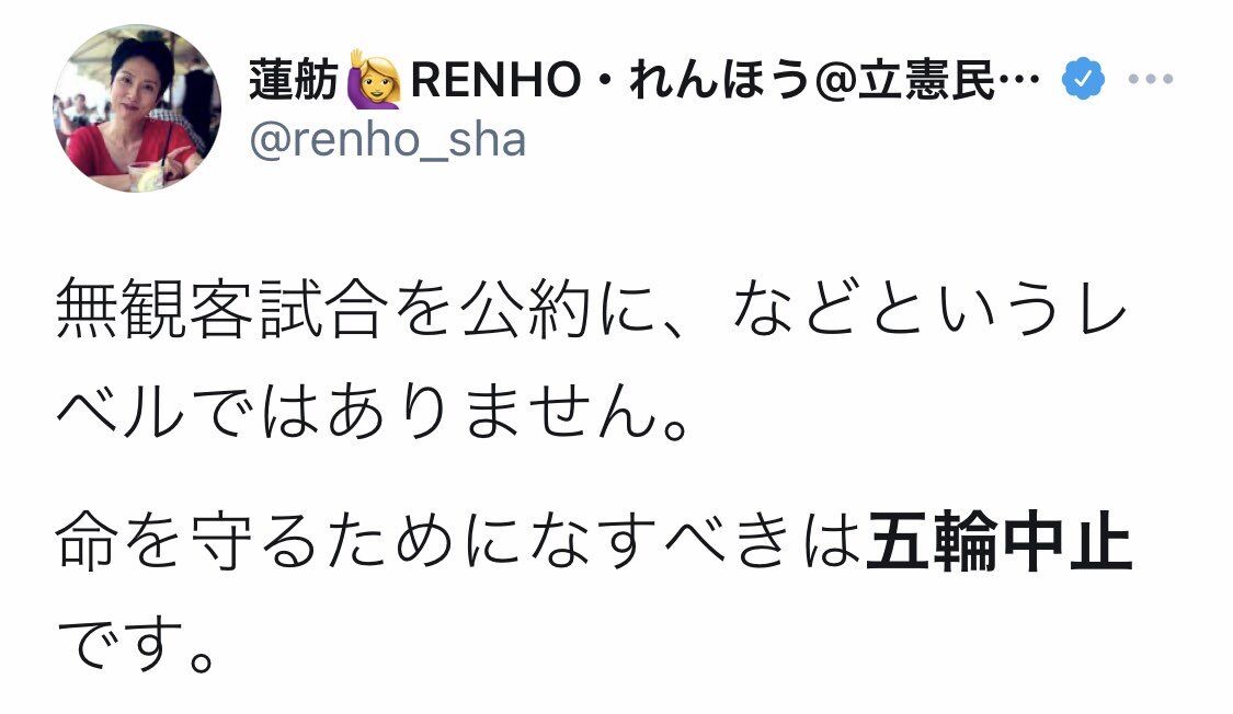 蓮舫 「五輪参加選手への応援と五輪辞めろは別です!今すぐ五輪やめろ!」