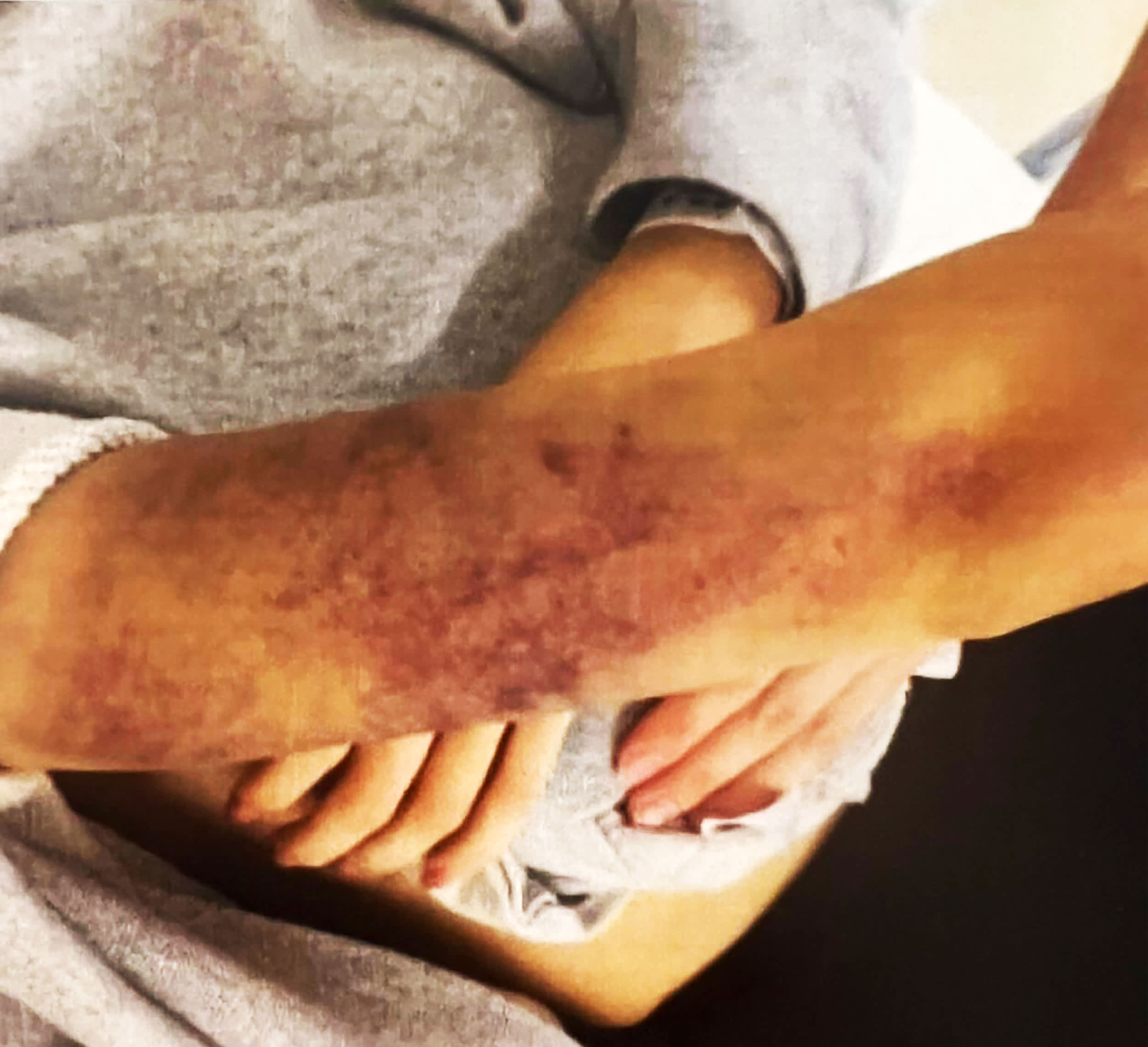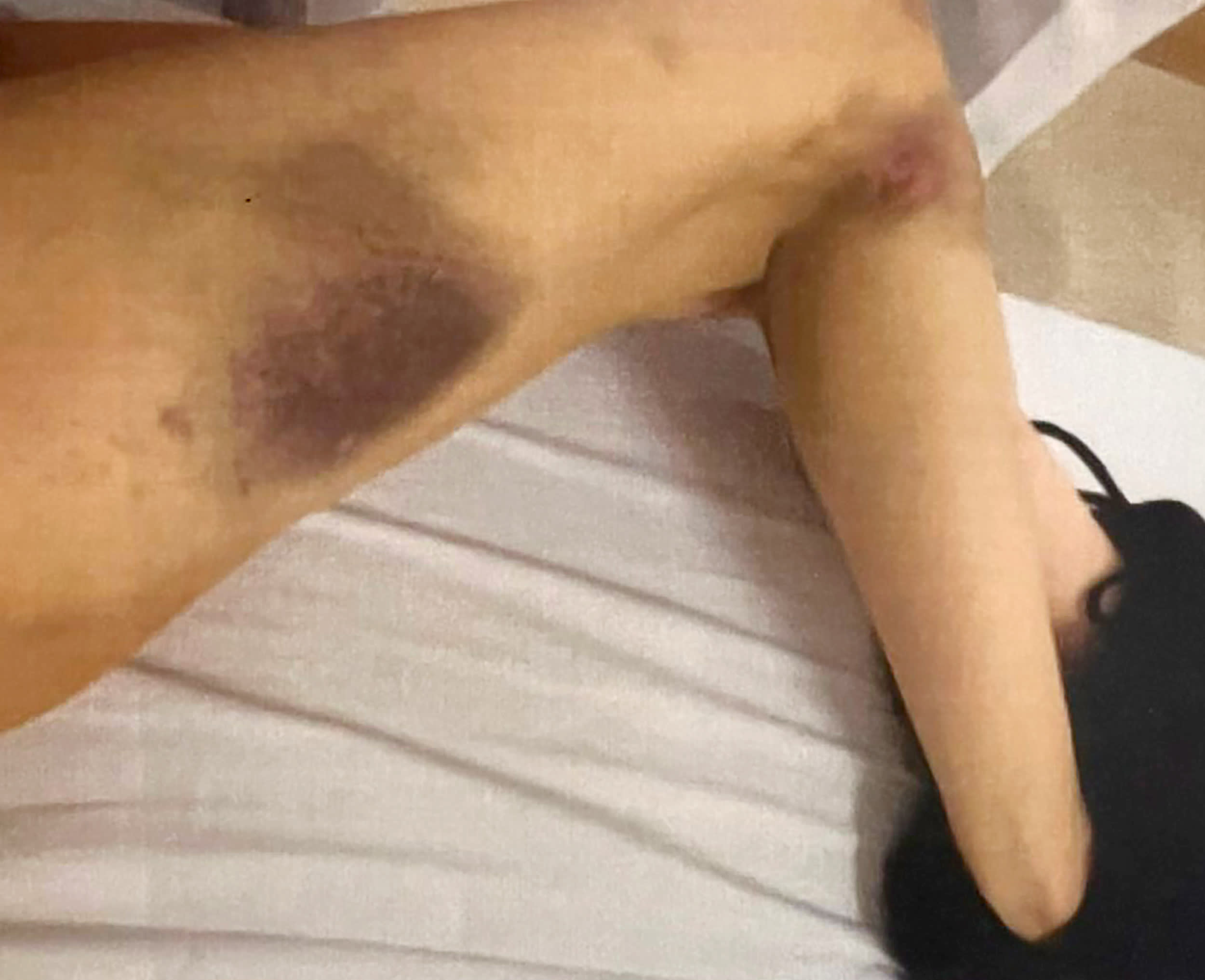 被害女性の腕には痛々しい痣が残っている。4日間にわたり、下田容疑者から暴行を加え続けられたという