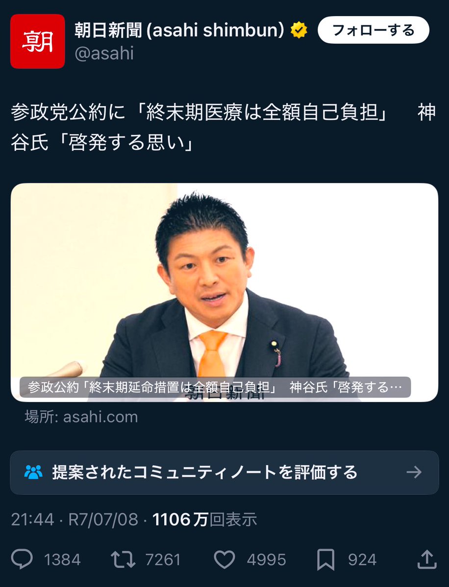 参政公約「終末期延命措置は全額自己負担」 神谷氏「啓発する思い」https://t.co/yFdqZHsluw