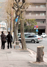 大津市のJR西大津駅前にあるパチンコ店を建てた市内の建設会社が昨年12月、下請けの造園業者に指示し、店の前にある市管理の街路樹4本を無断で伐採していたことがわかった。建設会社側は「見た目が悪かったので(伐採を)指示した」と説明。