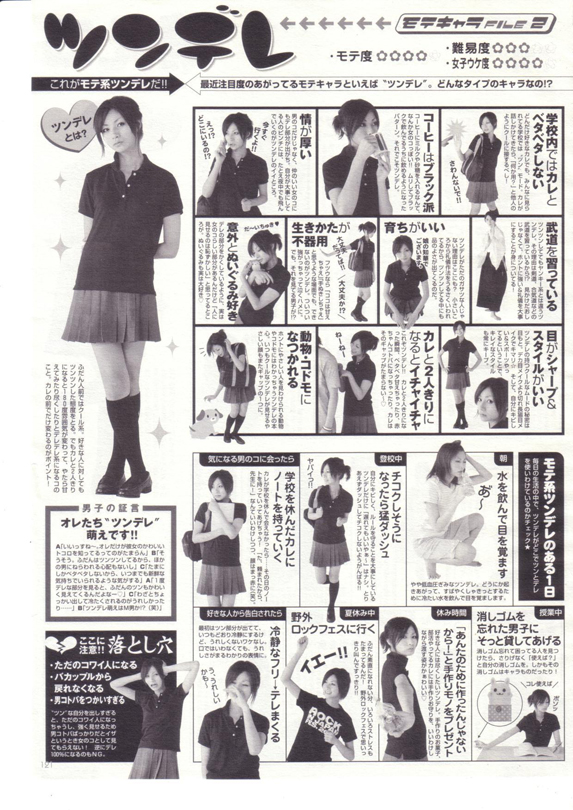 普段はツンツンしているくせに、好きな人を目の前にするとデレッとしてしまう萌え属性、通称「ツンデレ」。今やオタク業界の人気者という枠を飛び越えて、某ティーン向け女性雑誌に“モテキャラ”としてフィーチャーされるまでになっているらしい。まずは、ツンデレの特徴を紹介している箇所にて。