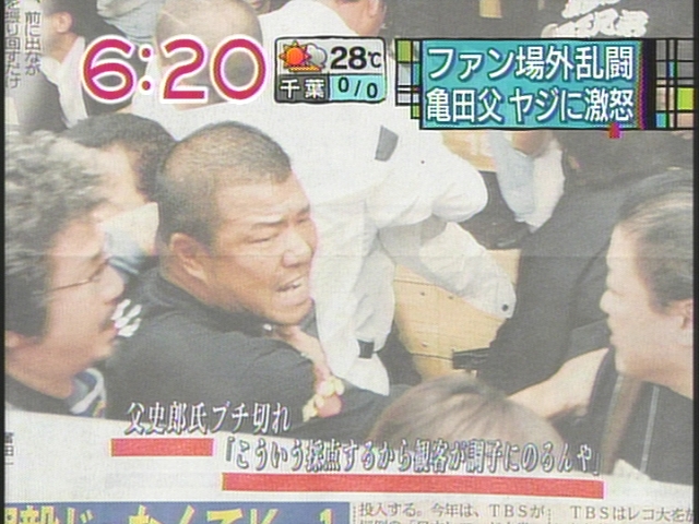 東京・後楽園ホールで27日に行われたプロボクシング8回戦の亀田大毅(協栄)−バレリオ・サンチェス(メキシコ)戦の判定をめぐり、観客席で乱闘があった。関係者の話を総合すると、試合後に亀田大がリングでインタビューを受けている際にやじが飛び、これに亀田ファンの一部が激高して殴り合いになった。セコンドを務めた亀田の父、史郎トレーナーも突進し周囲に止められた。